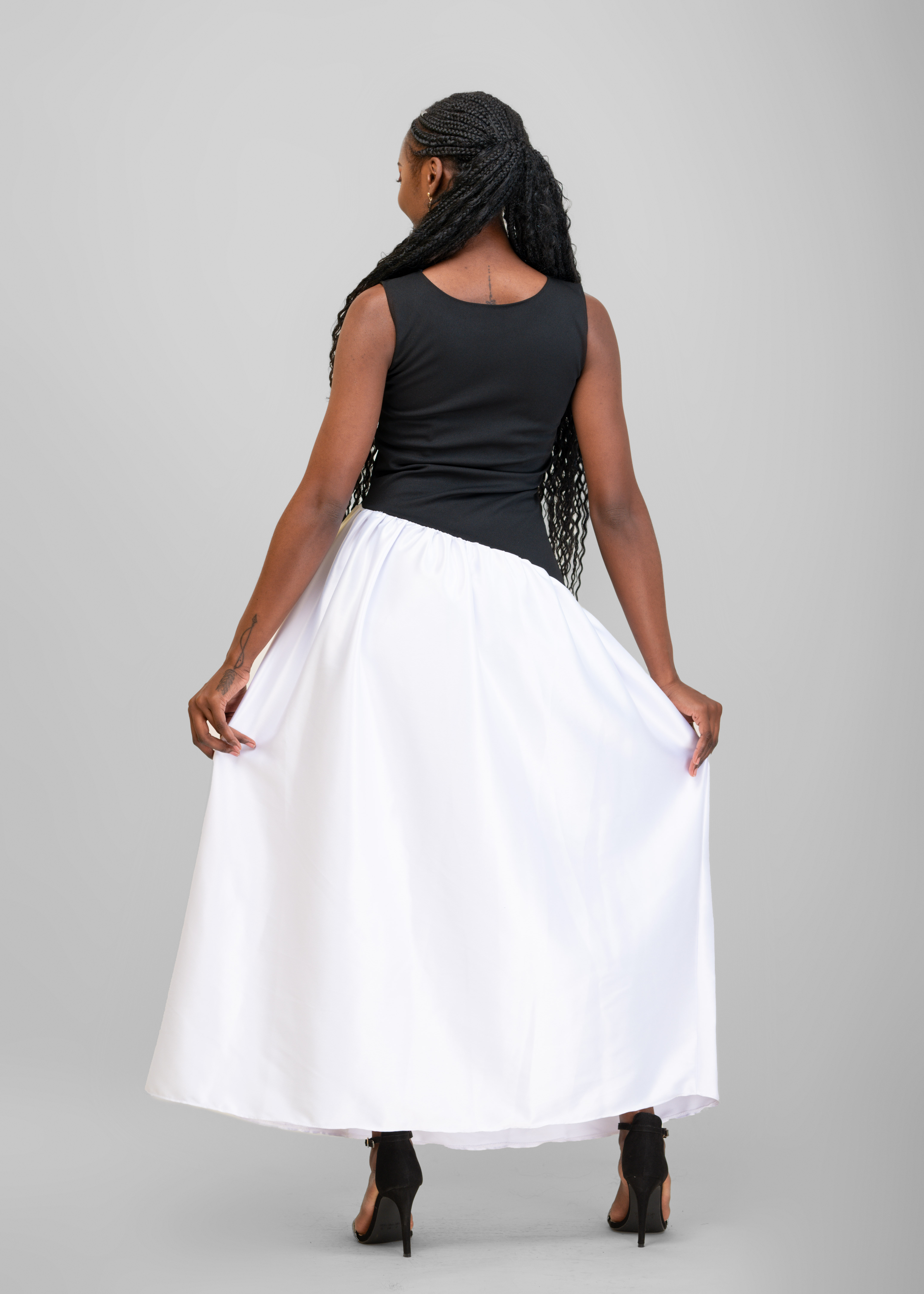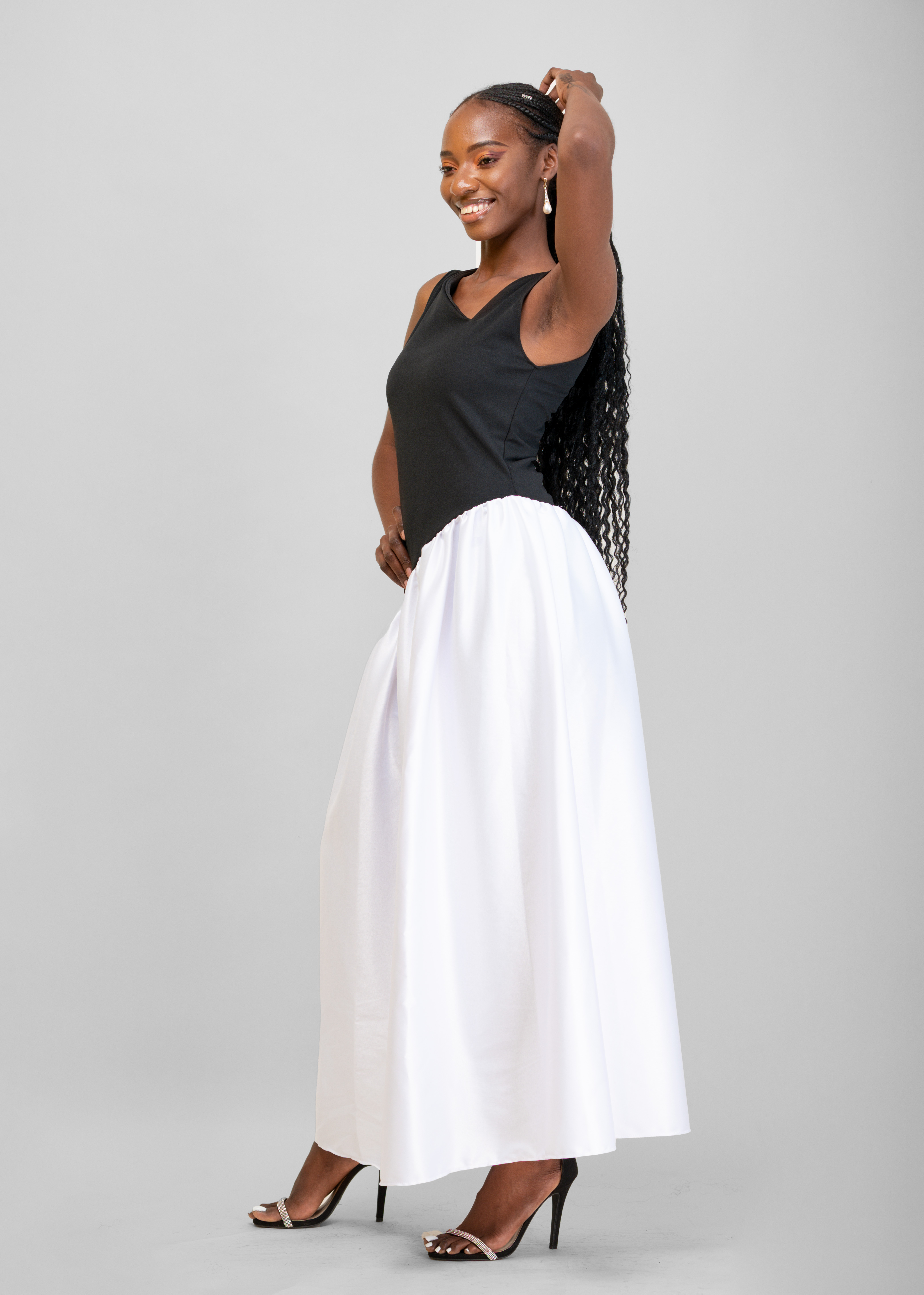Raffles on the bottom part of the dress, a unique V-Neckline for an elegant touch and a zipper at the back for ease while wearing.