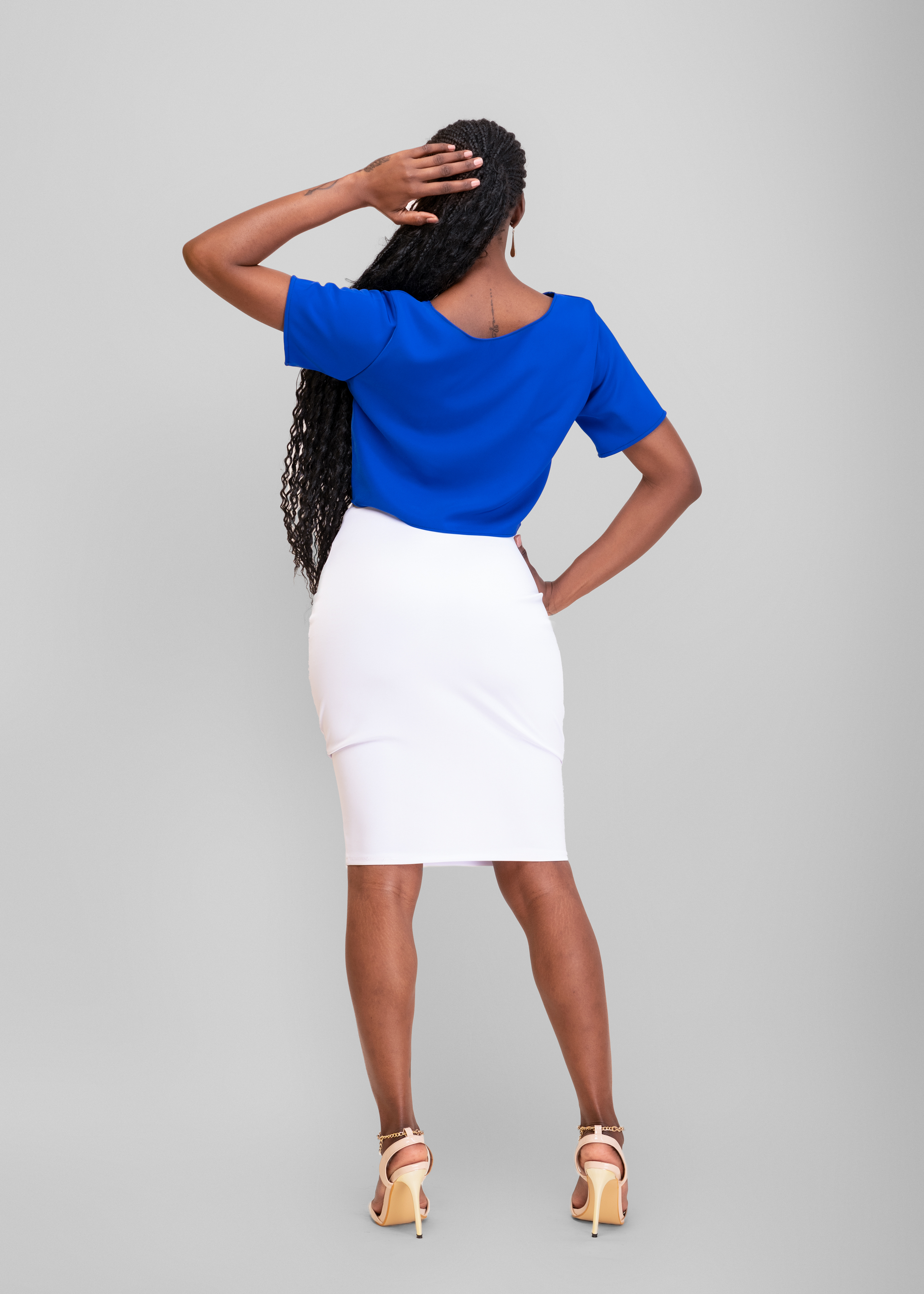 STYLING TIPS: This top can be paired with skinny jeans or a pencil skirt (like the model) to compliment its form fitting nature and a neck piece to accessorize.